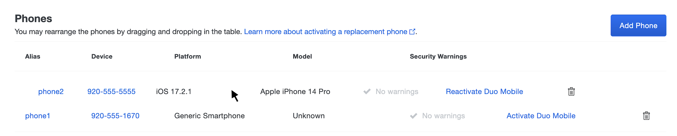 Manage phones, hardware tokens, and other two-factor authentication devices from the Duo Admin Panel.