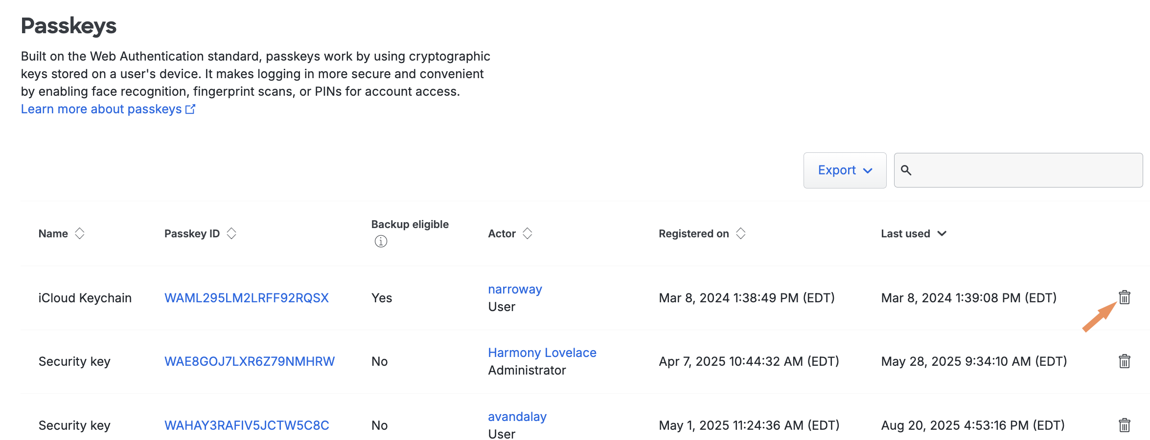 Click the Export button in the upper right side of the passkeys list and select CSV, JSON, or PDF to download a a list of devices. You can also select URL to obtain a direct link to your current view. If you've filtered your current view, the report only includes the filtered results.