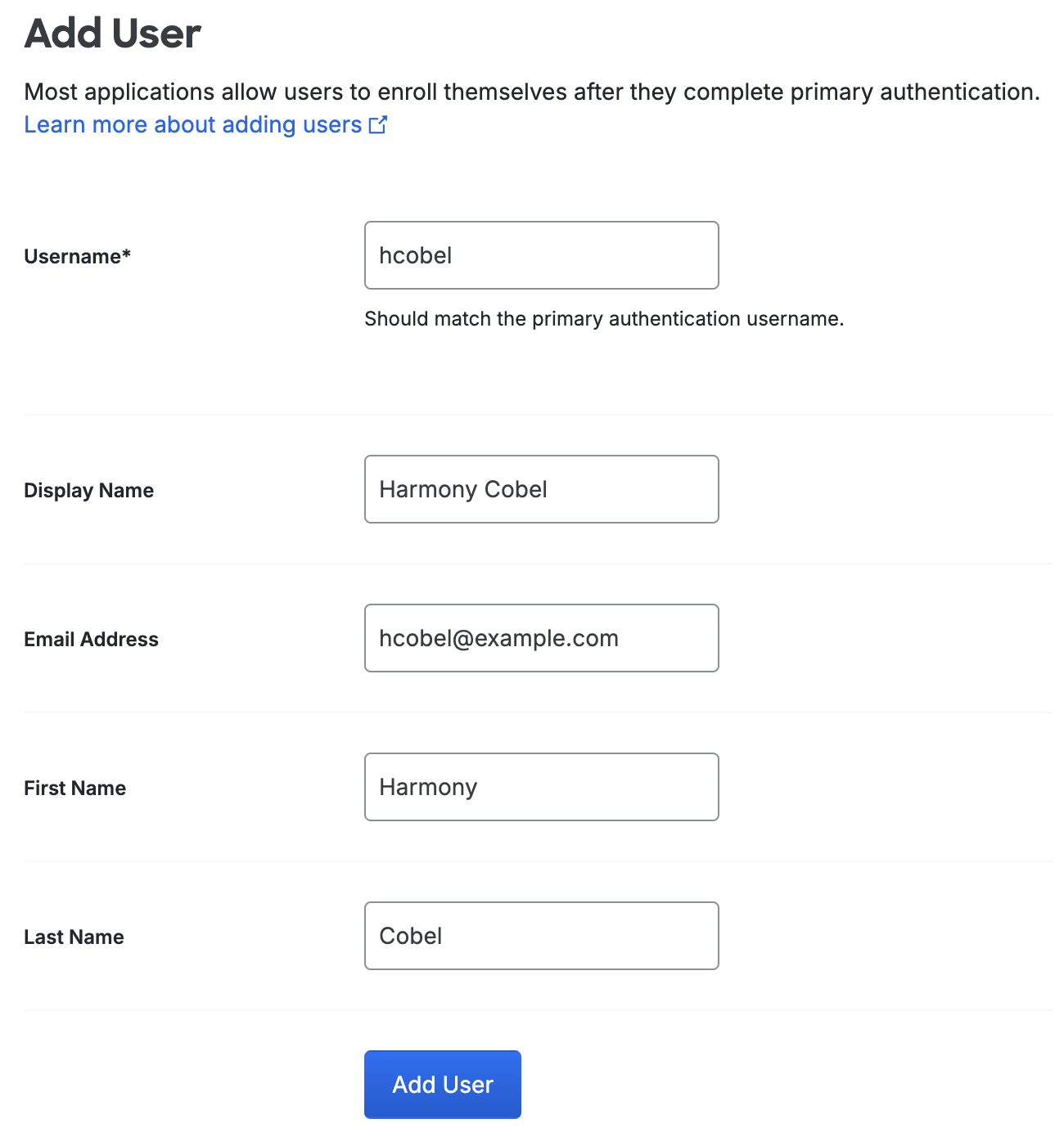 Other user information — Display Name, Email Address, First Name, and Last Name — is optional. You must provide an email address for the user if you want to email them enrollment links or Duo Mobile activation links.