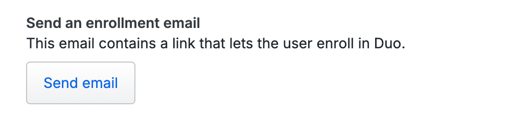 When a user already exists in Duo with an email address present in the user's details, but has yet to set their Duo password or register any authentication devices, you can send an enrollment email to the user from the Admin Panel. If an enrollment email was already sent to the user by any method (manually by a Duo admin, automatically as part of directory sync, etc.) but the user did not receive it or deleted it without enrolling, you can resend the email.
