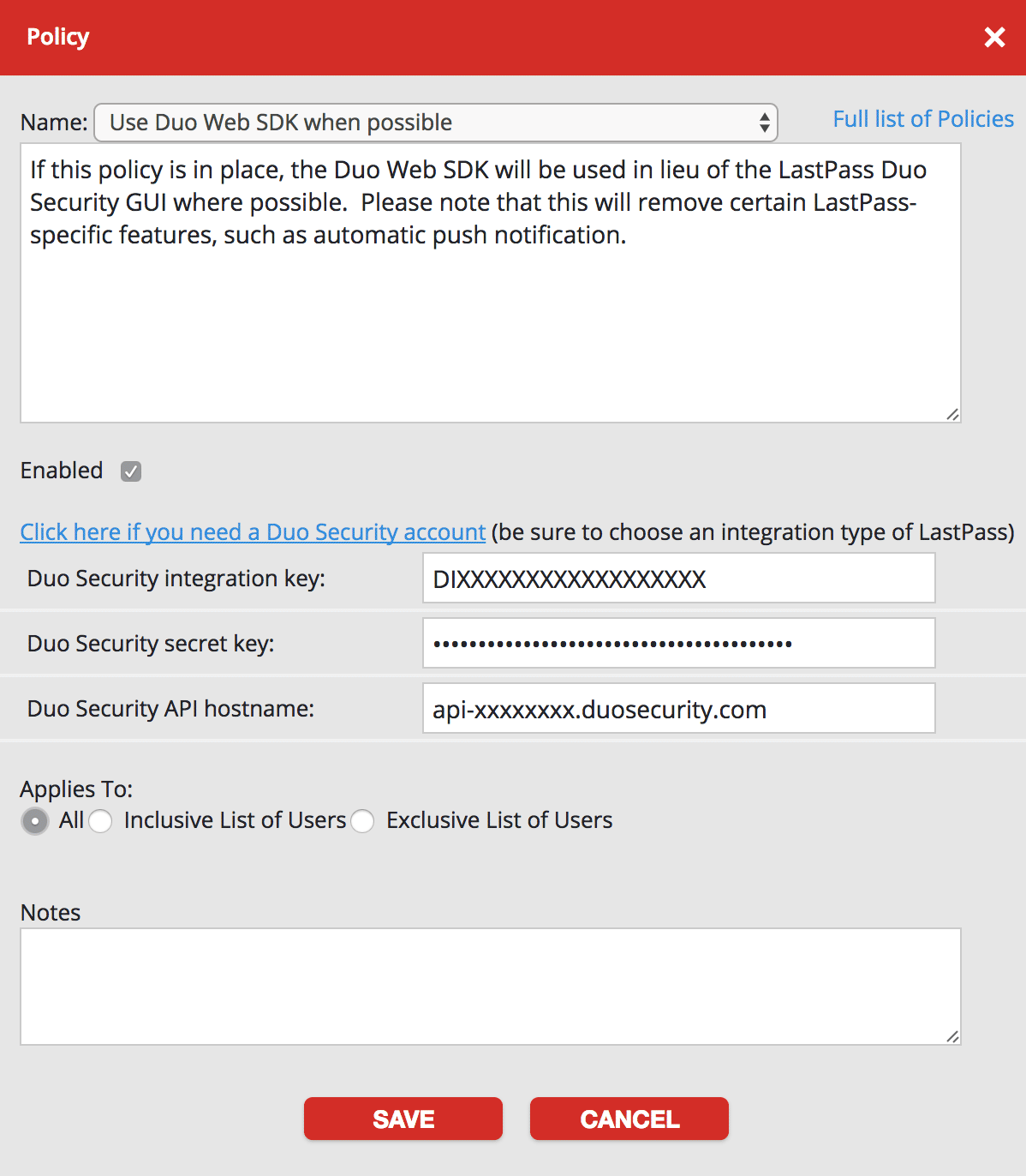 Need some help? Reach out to Duo Support for assistance with creating the LastPass application in Duo, enrolling users in Duo, Duo policy questions, or Duo authentication approval issues. For assistance configuring or managing LastPass please contact LastPass support.