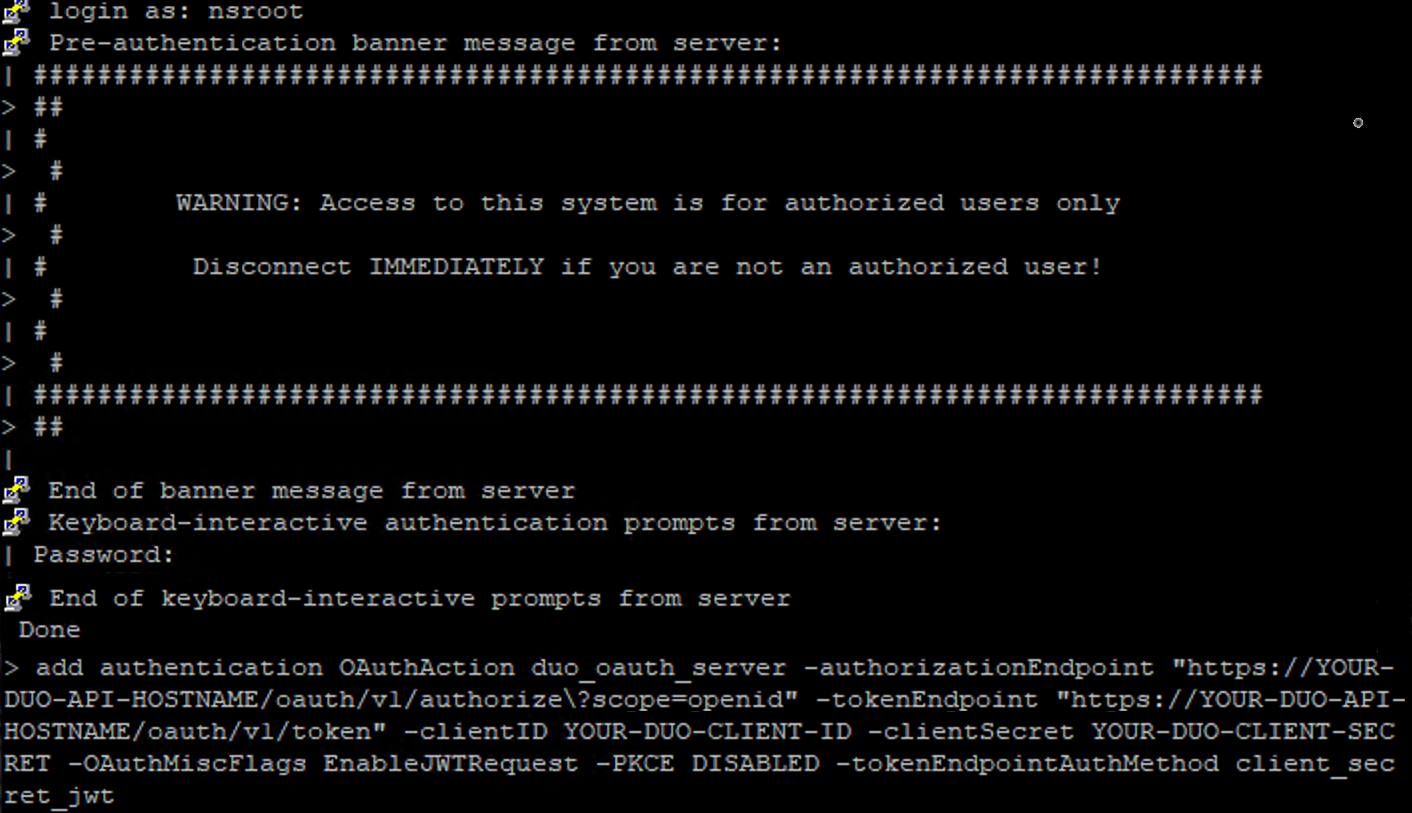 Please refer to the Step by Step configuration for Duo Universal Prompt documentation on Citrix Tech Zone and follow those instructions for adding Duo OIDC/OAuth authentication to your NetScaler logins, using the Client ID, Client secret, and API hostname information from the NetScaler Web application you created earlier when needed.