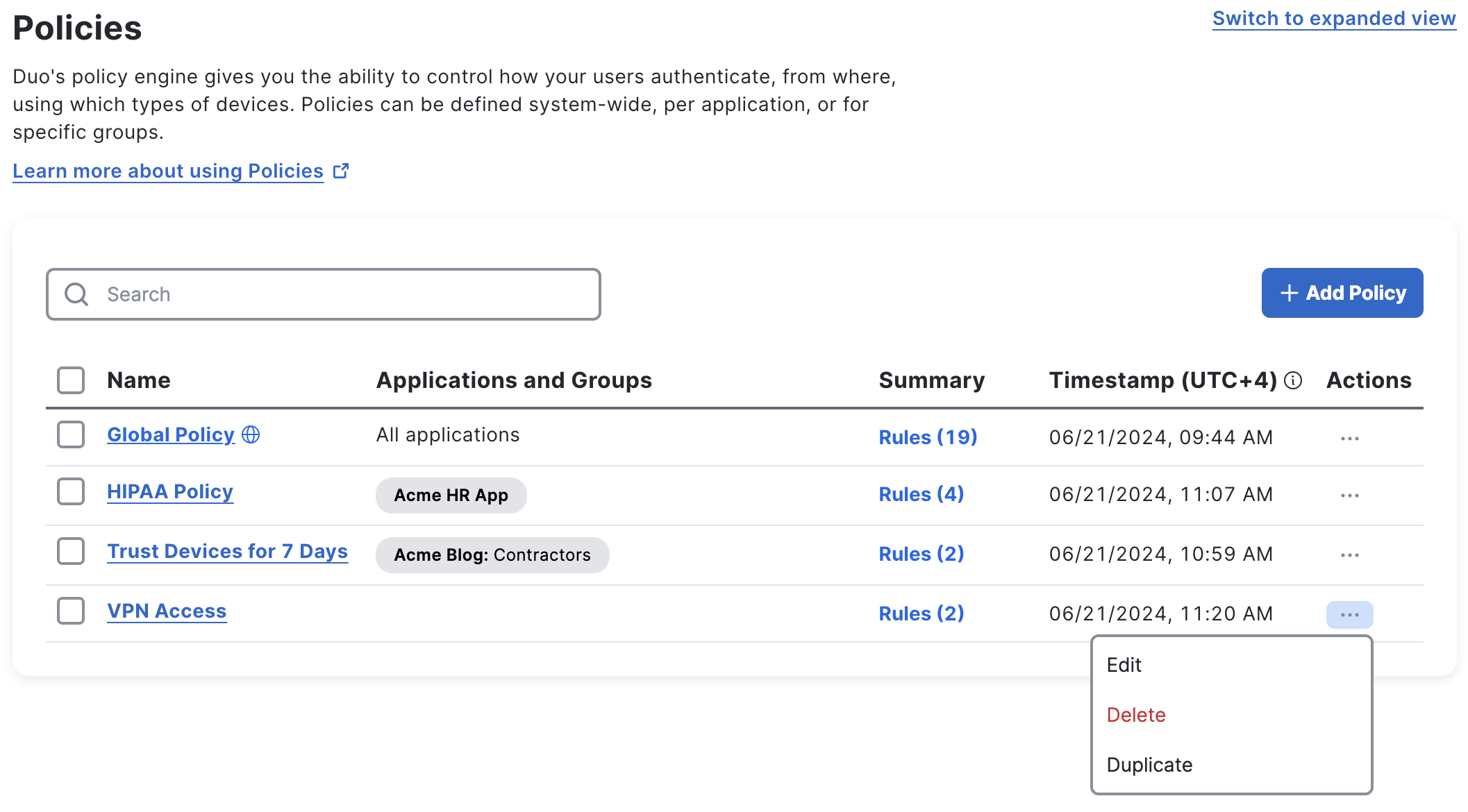 Create and manage your policies from the Policies page in the Duo Admin Panel.