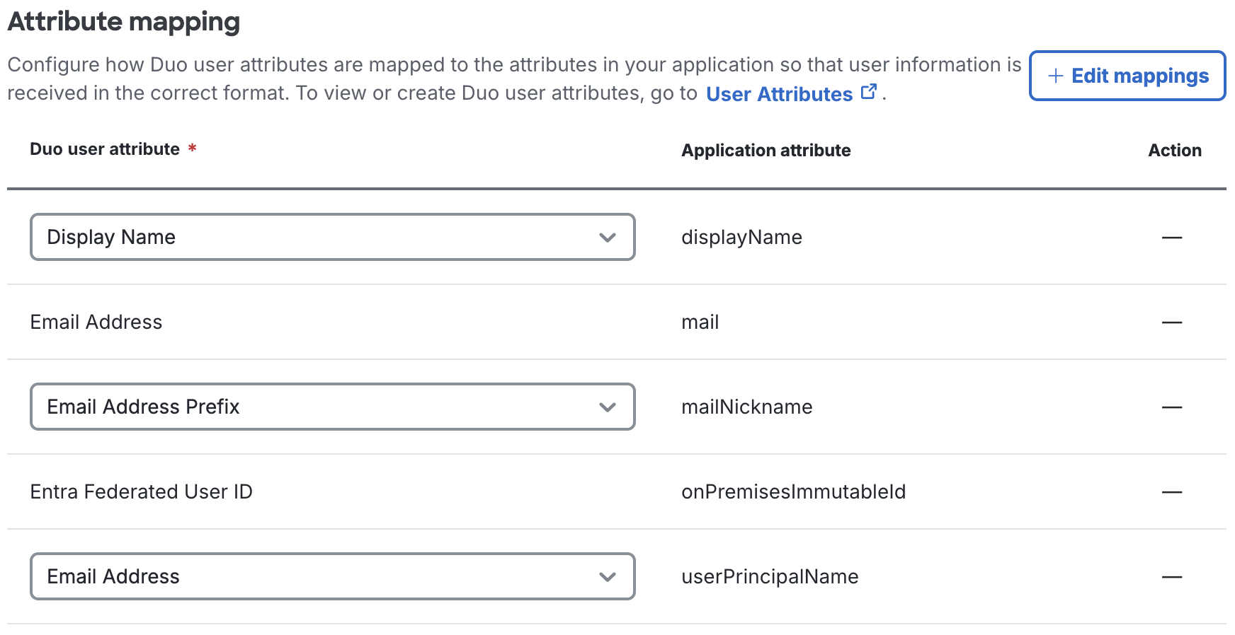 In the Duo Admin Panel, scroll down to "Attribute mapping". The default attributes are pre-populated and cannot be changed.