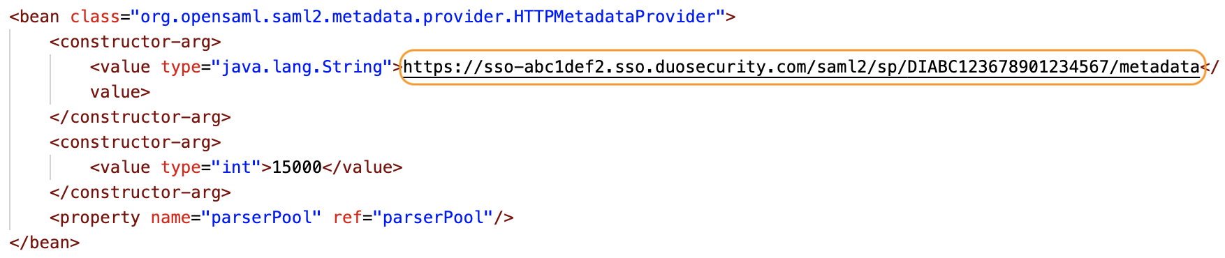 In the Sakai xlogin-context.saml.xml file, scroll down to constructor-arg and paste the HTTPMetadataProvider URL that you copied from Duo earlier into the defaultIDP line. See the image below for an example.