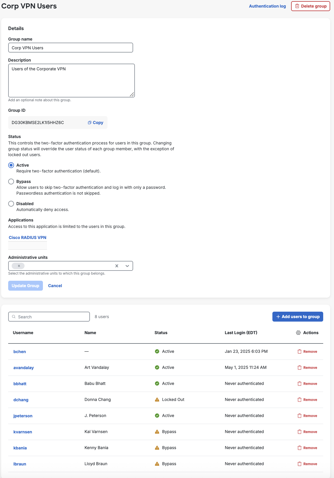 You can use groups to organize and manage users in Duo. For example, a group can be associated with a particular Duo application and configured so that only users who are members of that group can authenticate to that Duo application. You can change the status of a group to quickly enable or disable multiple users at once. You might also find groups useful for reporting and logging purposes, such as viewing authentication activity only for members of a particular group.