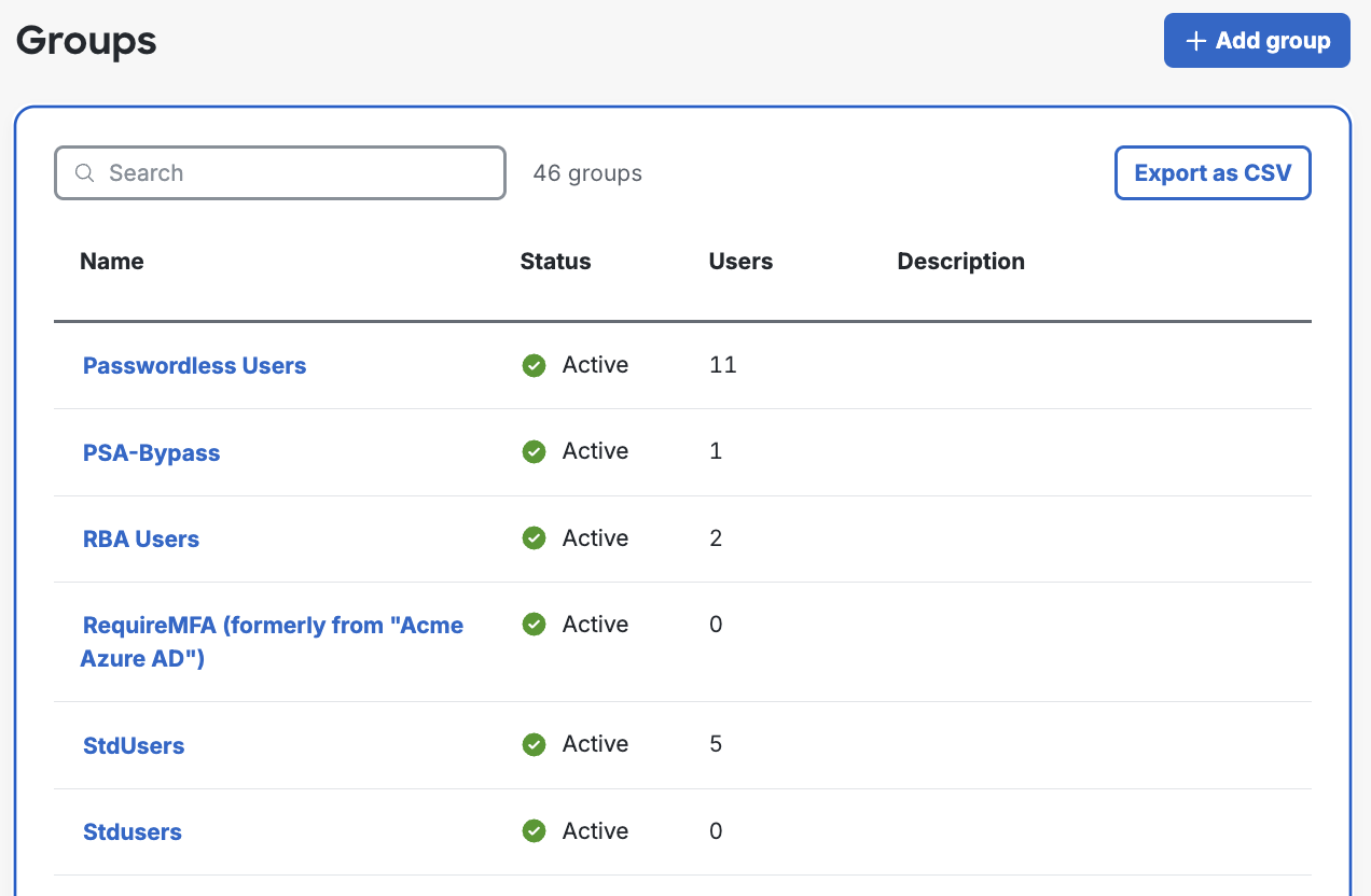 Click the Export as CSV button in the upper right side of the log display to download information about your Duo groups. The resulting file contains details about the groups and the users in each group. No details are exported for empty groups.