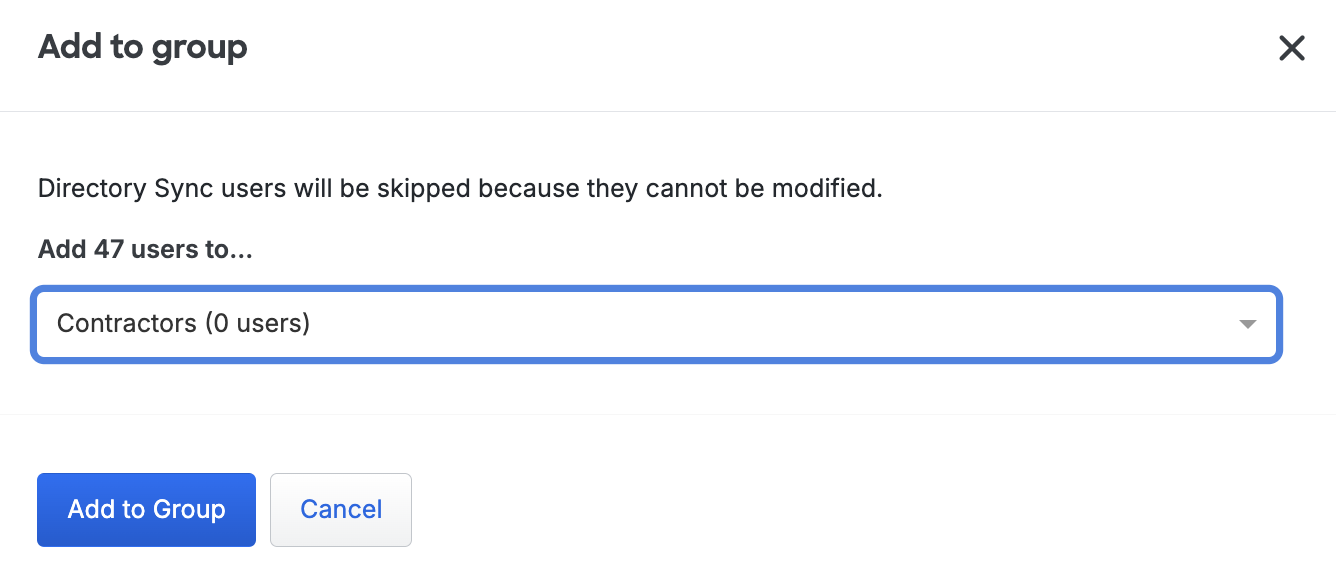 When using directory synchronization with Duo, you have already imported users and their groups as part of the group synchronization process. When Directory Sync manages a group, membership changes must originate from the source directory.