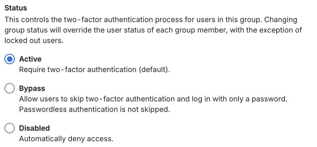 Bypass status means that the user is not required to use two-factor authentication and is not subject to any policy settings restricting access when logging on to a protected resource. When a user's status is Bypass but the user is a member of a group whose status is Disabled, or if the user is Disabled and is a member of a group that is set to Bypass, the user's effective status is Disabled. Bypass status of a user or group takes precedence over Active status of a user or group. If a user is a member of a group with Bypass status and a group with Active status, then the Bypass status is effective and the user is not prompted for two-factor authentication.